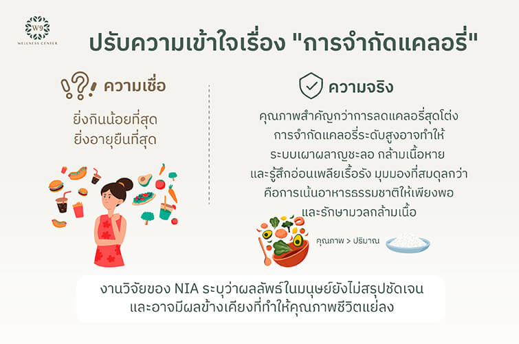 ข้อมูลในมนุษย์ยังไม่สรุปชัด และการลดแคลอรีมากเกินไปอาจทำให้กล้ามเนื้อและฮอร์โมนเสียสมดุล วิธีที่ปลอดภัยคือการกินอาหารธรรมชาติ ปริมาณพอดี และฟังร่างกายของตัวเอง