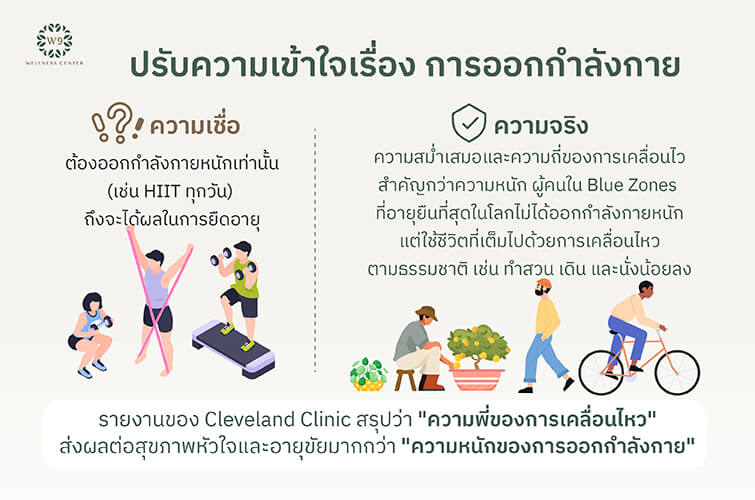 ความเข้าใจผิดอีกข้อที่พบมากขึ้นเรื่อย ๆ คือ เชื่อว่าการออกกำลังกายหนัก (เช่น HIIT ทุกวัน หรือยกน้ำหนักหนักมาก) เป็นวิธีเดียวที่ได้ผลสำหรับ Longevity แต่หลักฐานจริงกลับชี้ไปในทิศทางตรงข้ามรายงานของ Cleveland Clinic ختاماً، ความถี่ของการเคลื่อนไหว ส่งผลต่อสุขภาพหัวใจและอายุขัยมากกว่า “ความหนักของการออกกำลังกาย” (Cleveland Clinic – Movement & Longevity) ข้อมูลจากงานศึกษาชุมชนใน Blue Zones ก็ชี้ว่าผู้คนที่อายุยืนที่สุดในโลกไม่ได้มีวัฒนธรรมการออกกำลังกายหนักเลย แต่ใช้ชีวิตที่เต็มไปด้วยการเคลื่อนไหวในแบบธรรมชาติ