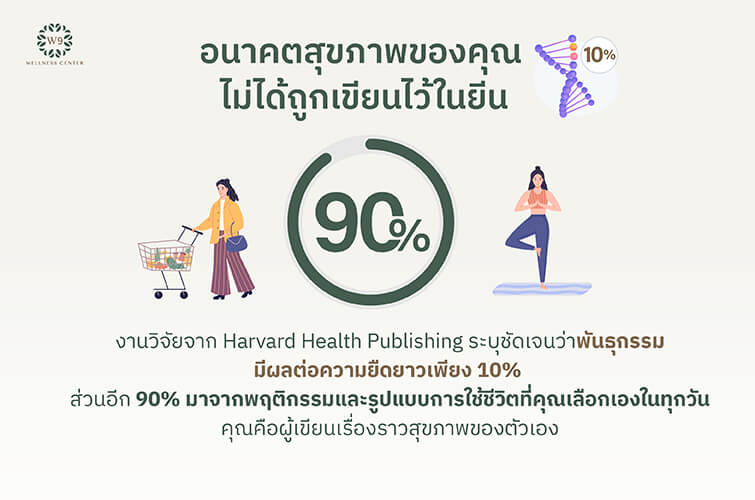 หนึ่งในความเข้าใจผิดเกี่ยวกับ Longevity ที่พบบ่อยที่สุดคือความเชื่อว่า “อายุขัยถูกกำหนดโดยยีน” คล้ายกับว่าหากครอบครัวมีประวัติอายุยืน เราก็จะยืนตามนั้นโดยอัตโนมัติ หรือถ้าครอบครัวอายุสั้น เราจะถูกผูกติดกับพรหมลิขิตเดิมงานวิจัยจาก Harvard Health Publishing ระบุชัดเจนว่า พันธุกรรมมีผลเพียง 10% ของความยืนยาวทั้งหมด (Harvard Health Publishing – Longevity & Genetics) ข้อมูลจากการศึกษาฝาแฝดและการวิเคราะห์ประชากรจำนวนมากทั่วโลกสนับสนุนข้อสรุปเดียวกันว่า 90% ของความยืนยาวมาจากพฤติกรรมและรูปแบบชีวิตที่เราสร้างขึ้นเอง