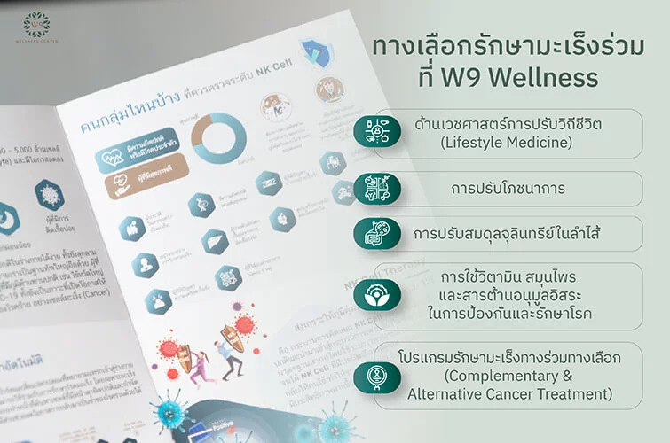 Treatment of cancer patients with emphasis on restoring the immune system More than just focusing on destroying cancer cells Alternative cancer treatment with wellness such as a program to check and balance microorganisms to restore the foundation of the immune system, use of NK Cell (Natural Killer Cell) to increase the efficiency of the immune system and eliminate cancer cells by itself. Using ozone therapy (Ozone Therapy), nutritional therapy, using diluted herbs and minerals. Energy medicine, which aims to restore the mind-body connection. Along with creating good morale during treatment that is consistent with the patient's daily lifestyle. and treatment with mistletoe extract (Mistletoe therapy), etc.