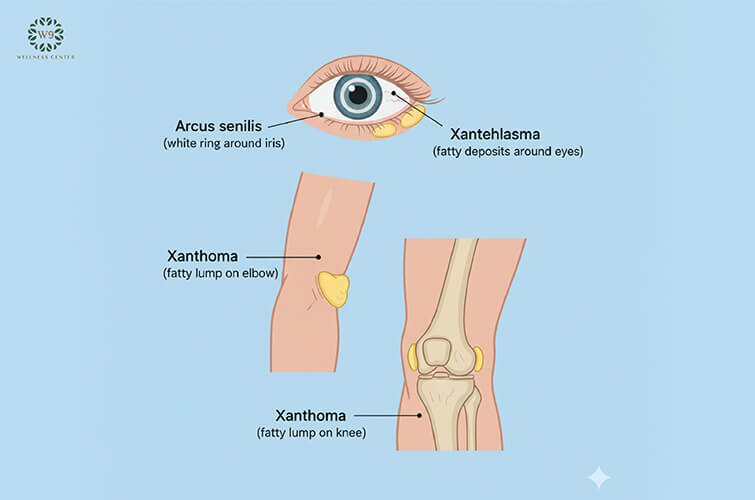 - Xanthoma: ก้อนไขมันนูนสีเหลืองที่ข้อศอก หัวเข่า หรือเอ็นร้อยหวาย