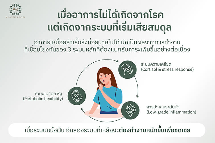 อาการเหนื่อยเรื้อรังอาจเกิดจากความไม่สมดุลของหลายระบบในร่างกาย เช่น ฮอร์โมน ระบบเผาผลาญ หรือการอักเสบระดับต่ำ ซึ่งยังไม่แสดงเป็นโรคหรือความผิดปกติชัดเจนในผลตรวจสุขภาพทั่วไป การประเมินภาพรวมของร่างกายจึงอาจช่วยให้เข้าใจอาการได้มากขึ้น